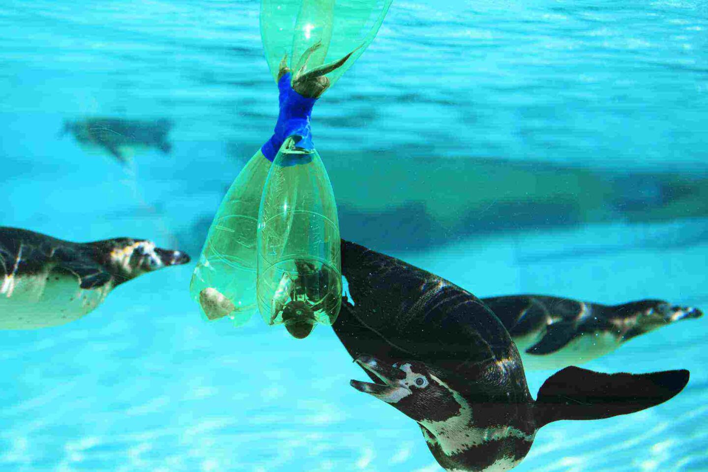 Humboldt Penguins Investigate Recycled Plastic Bottles at ZSL London Zoo. Images supplied by ZSL